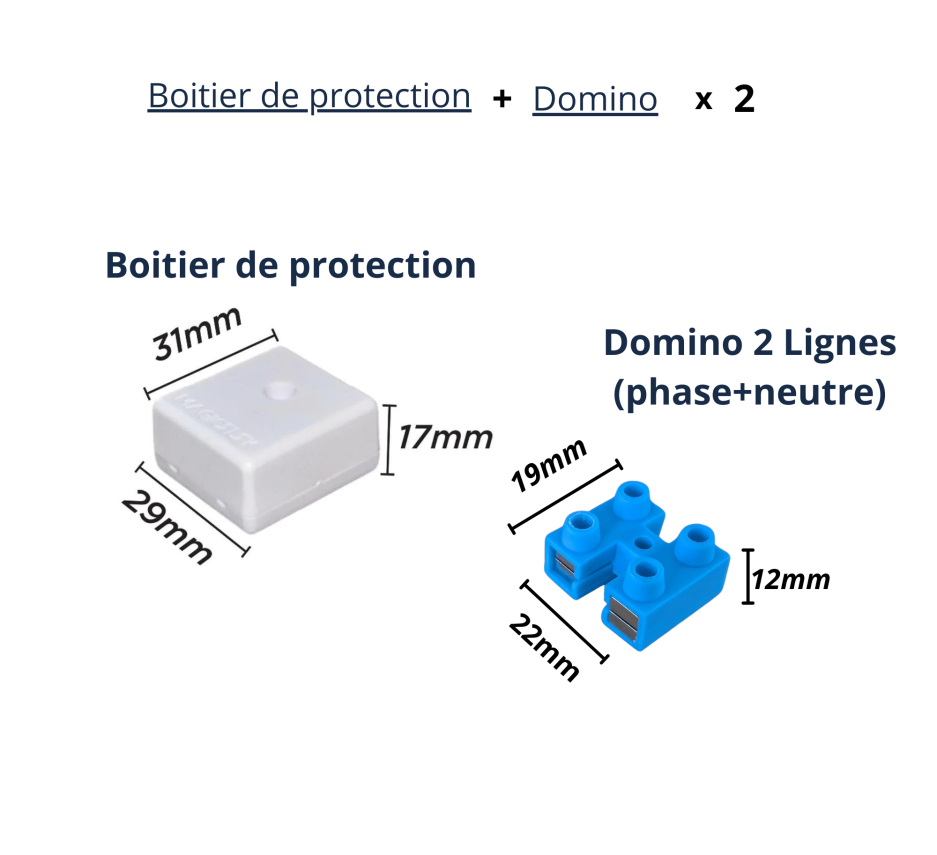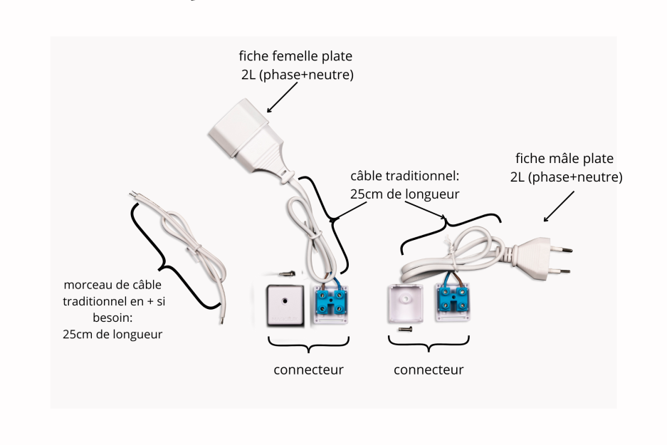 Nos adaptateurs sont simples d’utilisation. Ils sont essentiels afin d’établir le lien entre le courant électrique et votre appareil. Dans ce kit vous trouverez une paire de connecteur (boitier de protection + domino) : chaque connecteur est raccordé à un câble traditionnel de 15cm finissant par une fiche mâle plate pour l’un et une fiche femelle plate pour l’autre. Ceci vous permet de récupérer le courant d’un côté (fiche mâle plate) et de brancher votre appareil de l’autre (fiche femelle plate) grâce à notre câble ultra-plat au milieu de la connexion. Vous trouverez également les accessoires pour le montage (tournevis+ adhésif double-face+ glue).